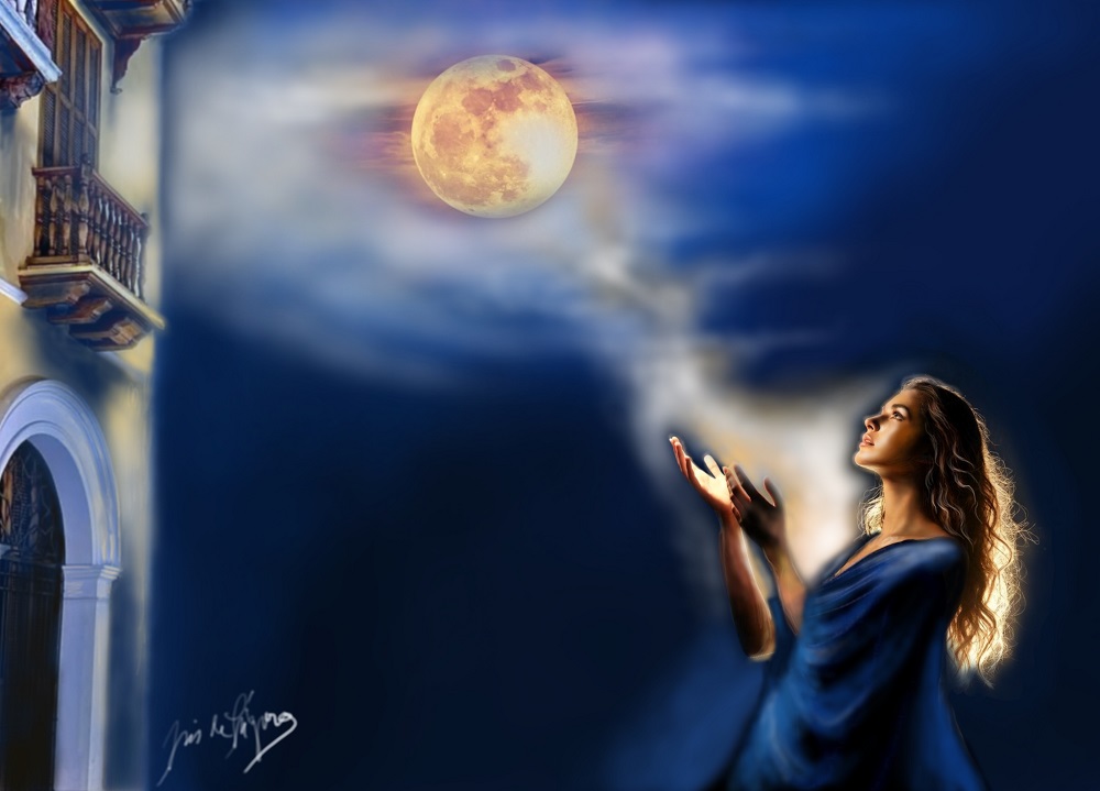 La luna, vestida con un resplandor más cálido que el acostumbrado, desciende hasta quedar casi a la altura de un balcón. La mujer extiende las manos, y desde el astro le llega una estela de luz fina. En ese intercambio silente, la ciudad parece renovarse, como si recibiera un secreto para recibir la llegada de otro año.